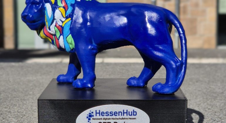 Bei der Verleihung wurde es dann „hessisch“: Die Preisträger*innen erhielten bunte OER-Löwen, während der Minister einen HessenHub-Bembel als Erinnerung überreicht bekam.